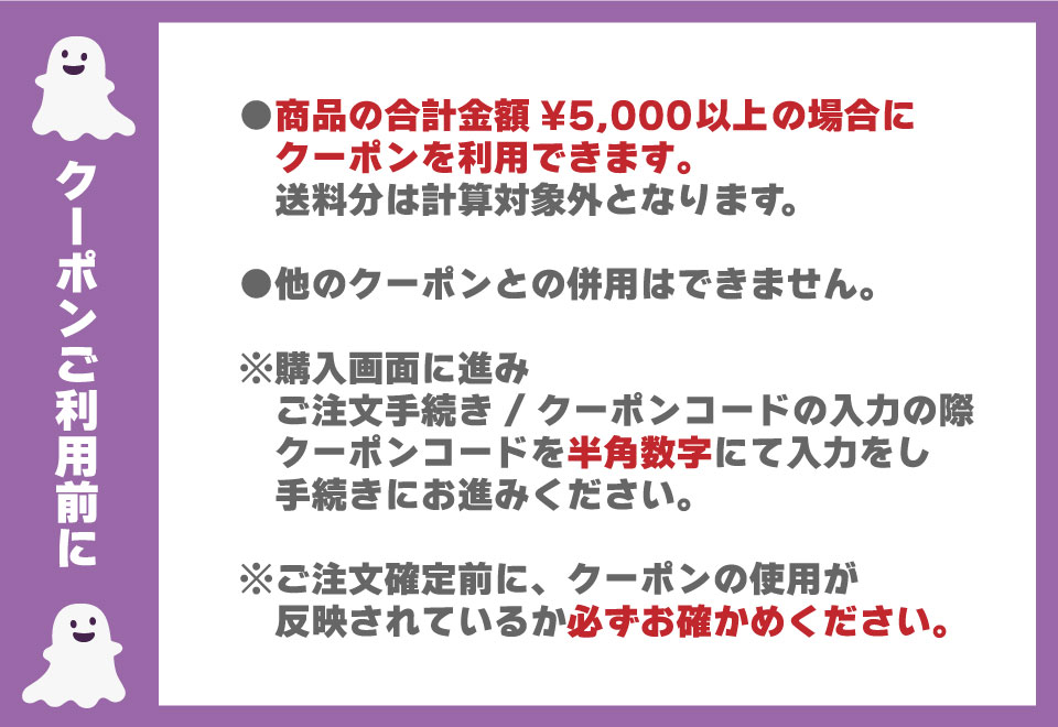 ・お買い上げ合計金額(税込)5,000円以上で、300円OFFクーポンの使用が可能です。※送料は含まれません。