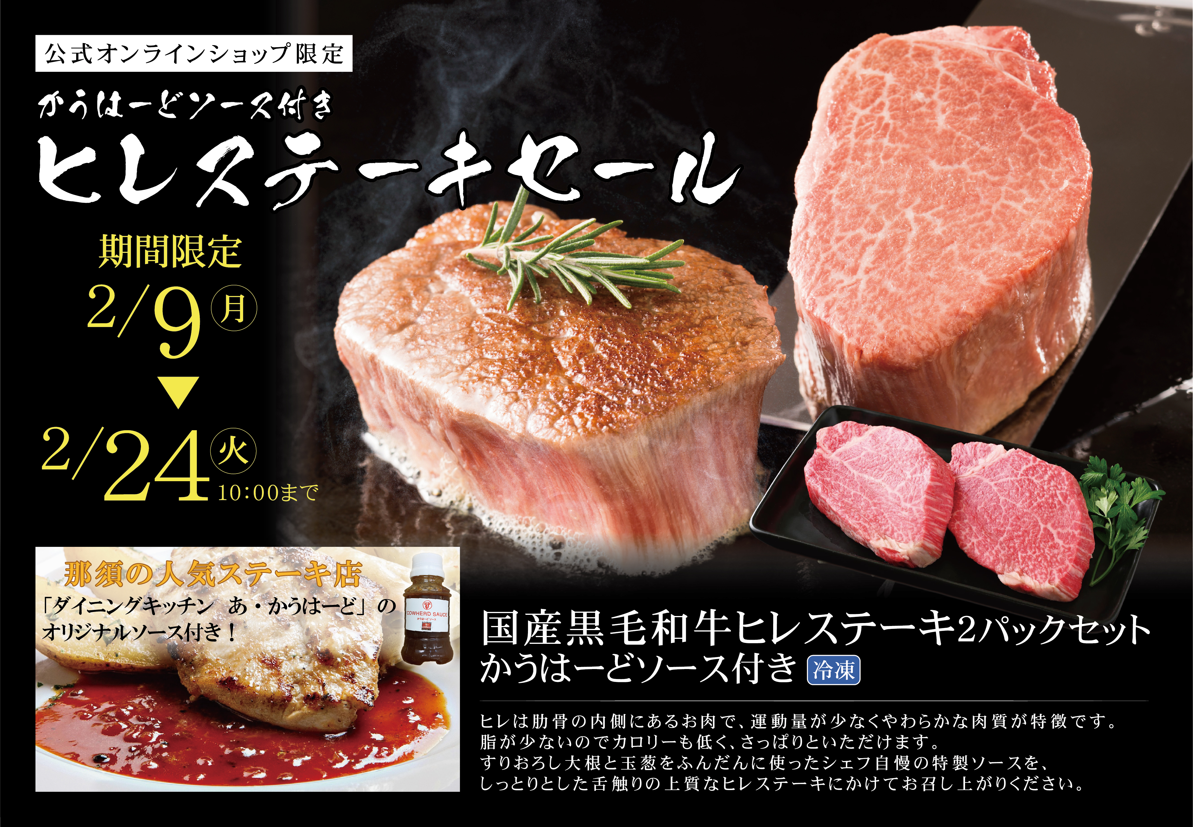 黒毛和牛ヒレステーキ(150g)2枚に、かうはーどソース(100g)が付いたセットが、通常価格「6,372円」のところ、8%オフの「5,890円」でのお買得キャンペーン!!